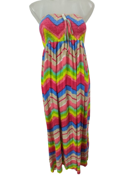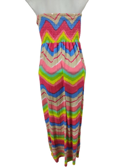 Női M-L-es színes csíkos pamut pánt nélküli maxiruha