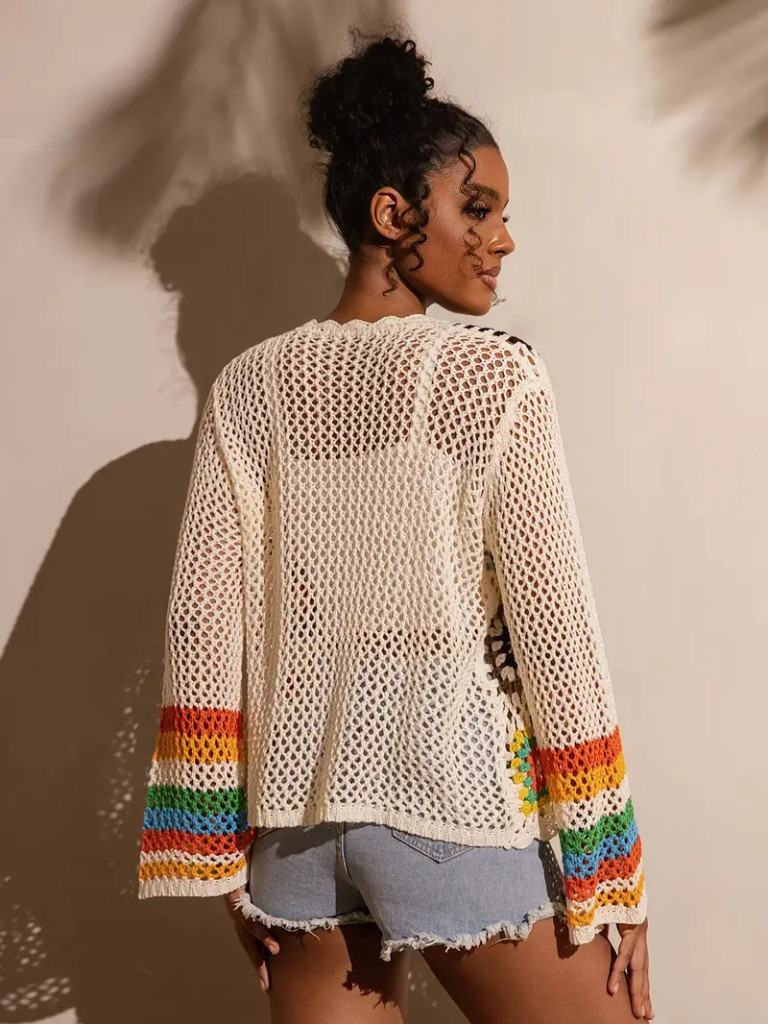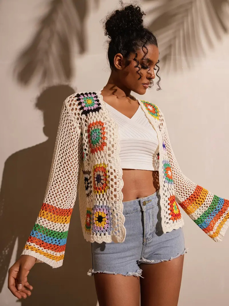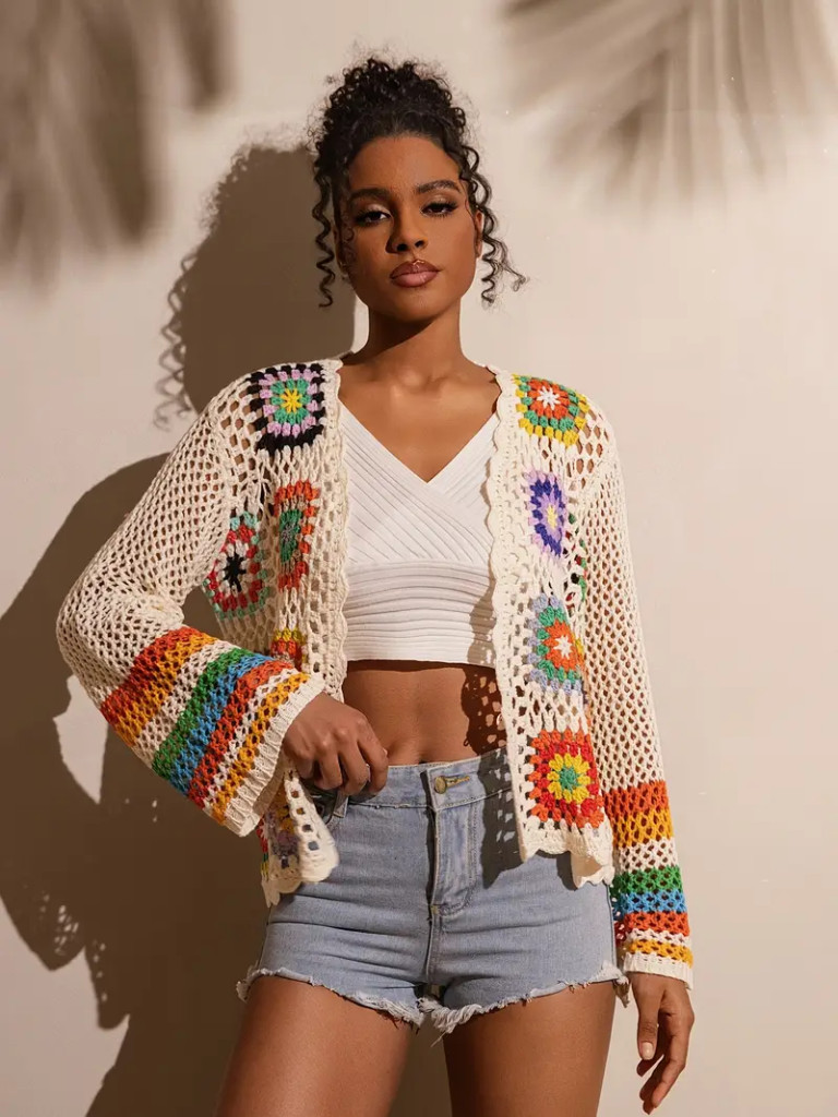 Női XL-es törtfehér, színes mintájú, horgolt kardigán - ÚJ