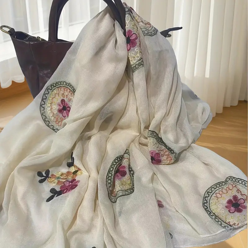 Törtfehér hímzett virágos muszlin kendő, sál - ÚJ