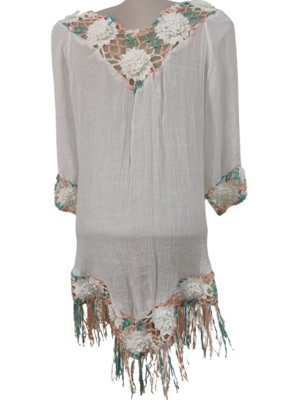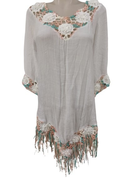Női fehér horgolt betétes rojtos aljú blúz, strandruha, tunika, one size - ÚJ